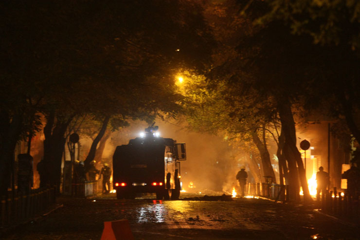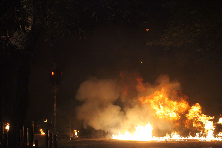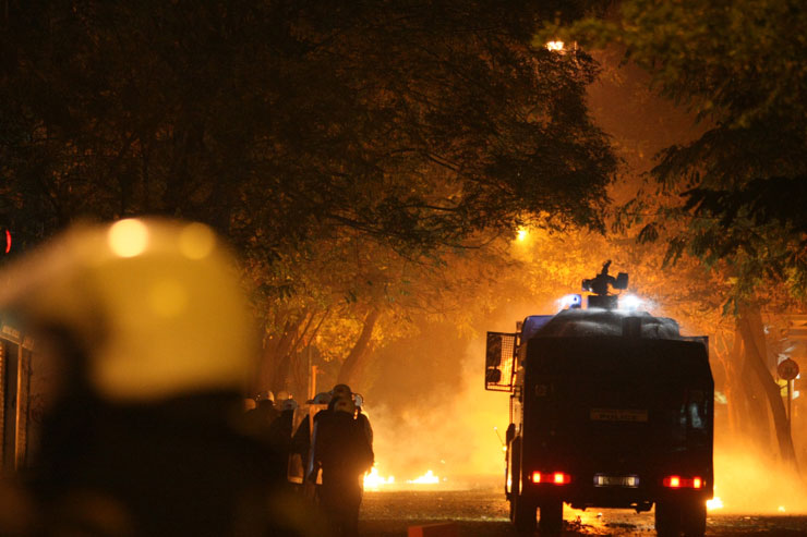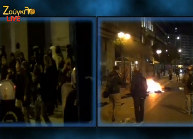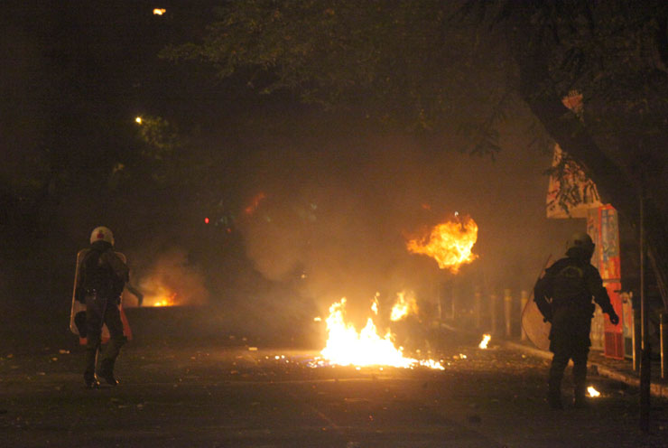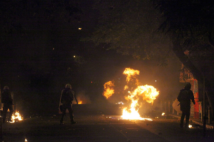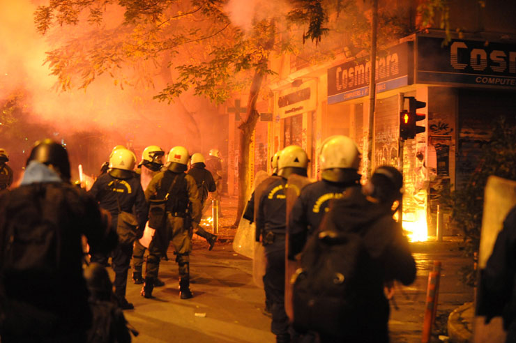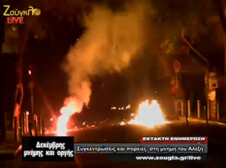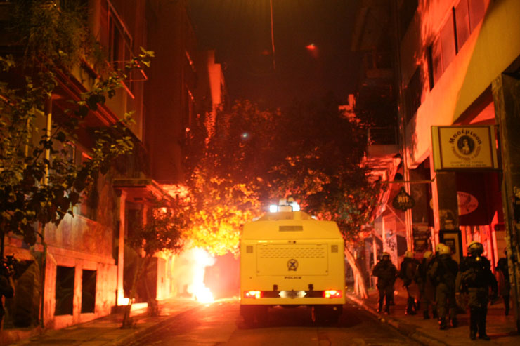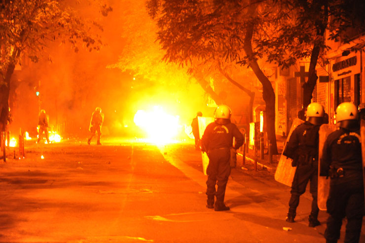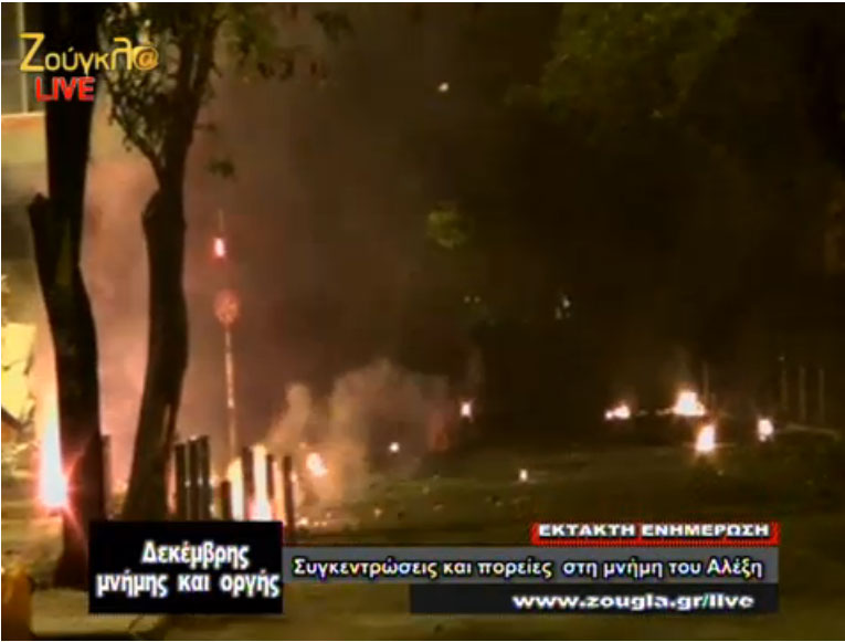 Τα επεισόδια επεκτάθηκαν με ταχύτητα και στους γύρω δρόμους. Ανά τακτά χρονικά διαστήματα ακούγονταν εκκωφαντικοί θόρυβοι από τις βομβίδες κρότου λάμψης που πετούσαν δυνάμεις των ΜΑΤ για να διαλύσουν τους διαδηλωτές. Κάδοι απορριμμάτων παραδόθηκαν στις φλόγες στη συμβολή των οδών Βαλτετσίου και Μπενάκη, ενώ εκδηλώθηκε πυρκαγιά σε διαμέρισμα α΄ ορόφου πολυκατοικίας.