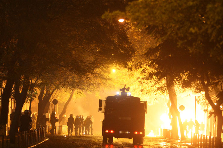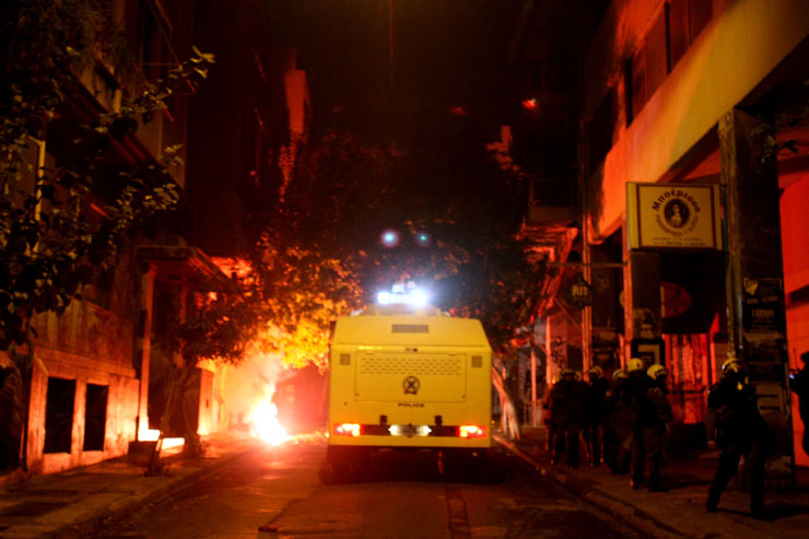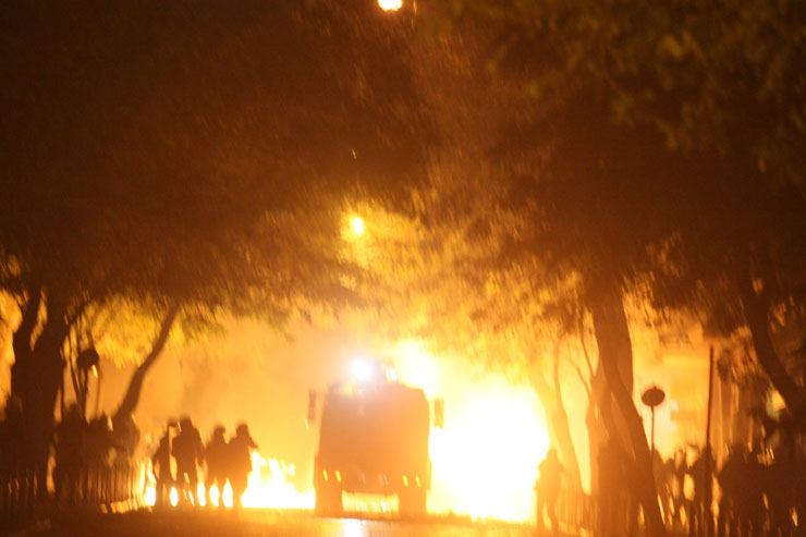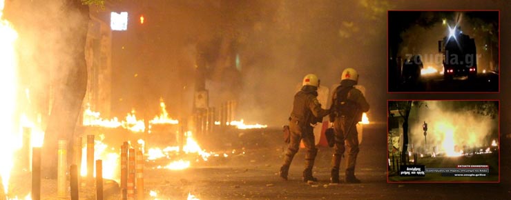 Η παρουσία των συγκεκριμένων οχημάτων στην περιοχή των Εξαρχείων προκάλεσε την οργή των διαδηλωτών, οι οποίοι πέταξαν πάνω τους διάφορα αντικείμενα και βόμβες μολότοφ.