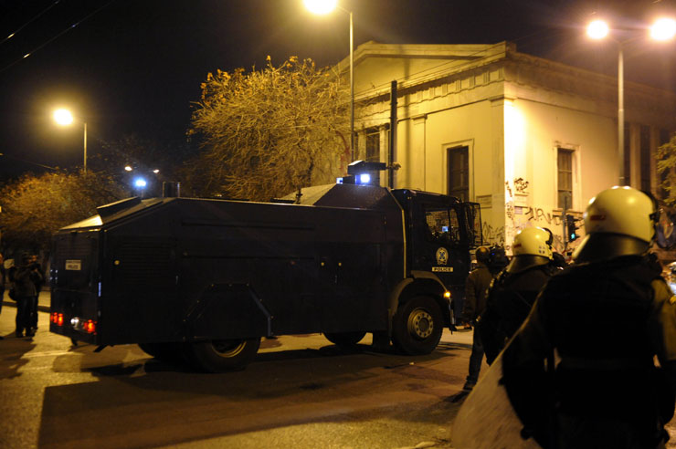 Αμέσως μόλις άναψαν τα αίματα στην περιοχή των Εξαρχείων δόθηκε εντολή για την ταχεία μεταφορά των ειδικά διαμορφωμένων τεθωρακισμένων οχημάτων για τη ρίψη νερού υπό πίεση (αύρες) από την πλατεία Συντάγματος προς τον χώρο των επεισοδίων.