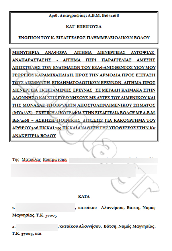 Ο Γ. Καραμιχαηλίδης εξαφανίστηκε το βράδυ της 30ής Αυγούστου 2016Το πρωί της Δευτέρας η μητέρα του 30χρονου, Ματούλα Κουτρώτσιου, κατέθεσε μηνυτήρια αναφορά στην Εισαγγελία Βόλου κατά δύο προσώπων, τα οποία ήταν τα τελευταία που συνάντησαν τον υιό της ζωντανό. Η μήνυση στρέφεται και κατά παντός υπευθύνου και αφορά στα αδικήματα της κακουργηματικής έκθεσης και παράβασης καθήκοντος.