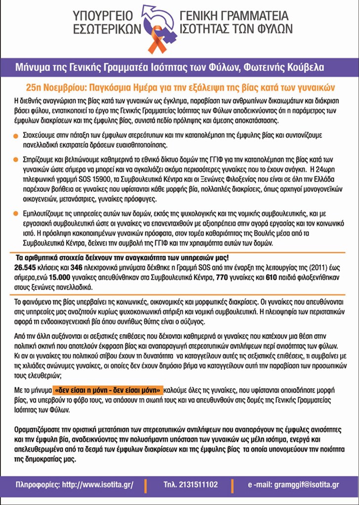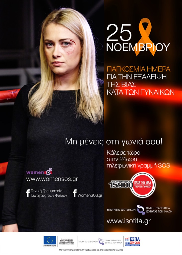 Εν όψει της ημέρας αυτής, η Γενική Γραμματεία Ισότητας των Φύλων δημοσιοποίησε ένα σποτ, με το οποίο καλεί τις κακοποιημένες γυναίκες «να μη μείνουν στη γωνιά» τους.