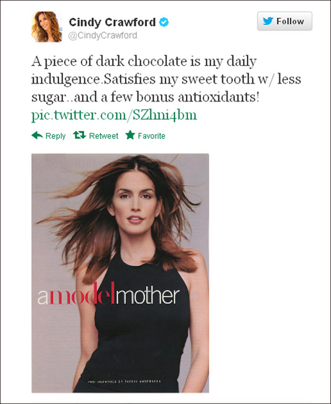 Η Σίντι, η οποία υπήρξε από τα πρώτα διάσημα τοπ μόντελ, και παραμένει κούκλα, αποκάλυψε την λατρεία της για την σοκολάτα με ένα μήνυμα στον προσωπικό της λογαριασμό στο twitter. Μαζί με το μήνυμα ανέβασε και φωτογραφία της, ωραιότερη από ποτέ, στο εξώφυλλο του νέου της βιβλίου με τίτλο «A Model Mother»- «Μητέρα Μοντέλο/ Πρότυπο». Στο μήνυμα έγραφε: «Ένα κομμάτι μαύρη σοκολάτα είναι η καθημερινή μου αμαρτία. Ικανοποιεί την αγάπη μου για τα γλυκά, με λιγότερη ζάχαρη. Και φυσικά λαμβάνω και μερικά αντιοξειδωτικά ως μπόνους».