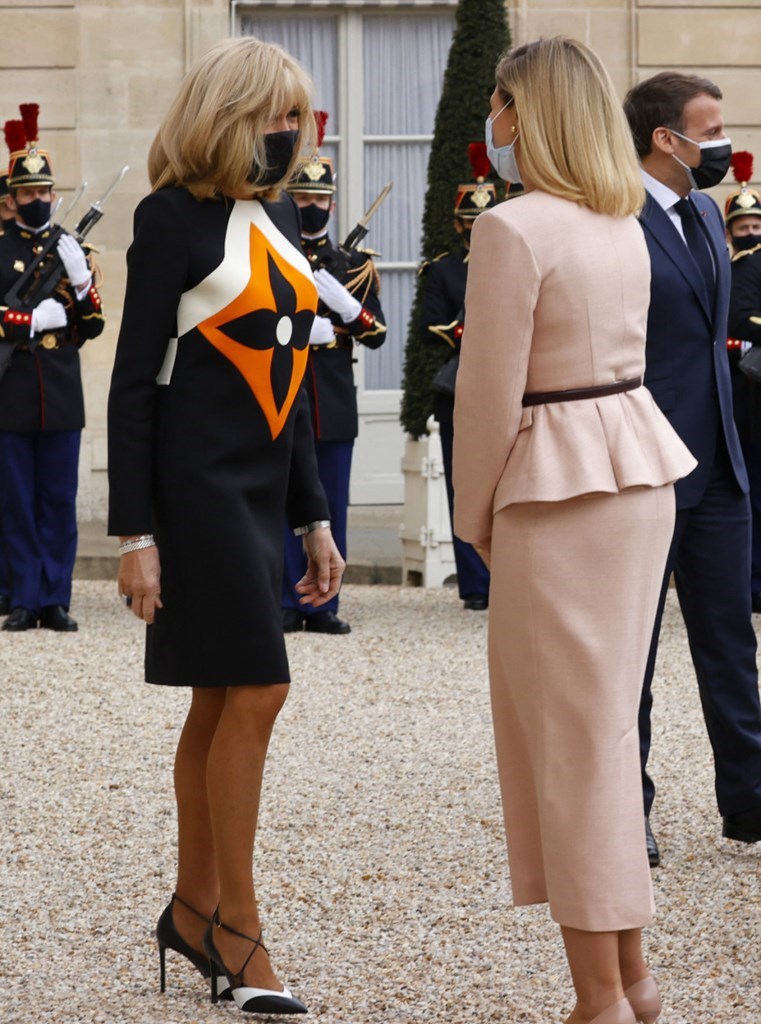 Τις εντυπώσεις έκλεψε για ακόμη μια φορά η Πρώτη Κυρία της Γαλλίας φορώντας ένα μαύρο φόρεμα του οίκου Louis Vuitton, το οποίο σχεδιάστηκε για εκείνη και το κόστος του υπολογίζεται περίπου στις 2.710 λίρες.