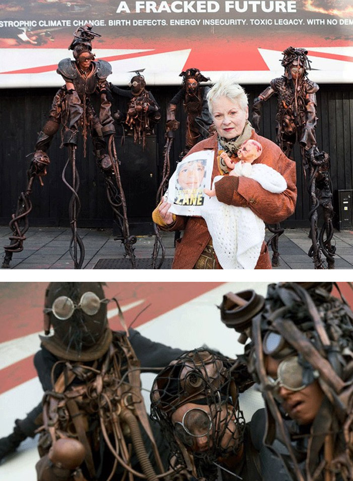 Έτσι, όταν η 74χρονη σχεδιάστρια και ενεργή ακτιβίστρια αποφασίσει να ηγηθεί μιας διαμαρτυρίας για την μόλυνση του περιβάλλοντος (anti-fracking protest) στην Westminster Bridge του Λονδίνου, δεν αποτελεί έκπληξη η ανταπόκριση της, στα media…