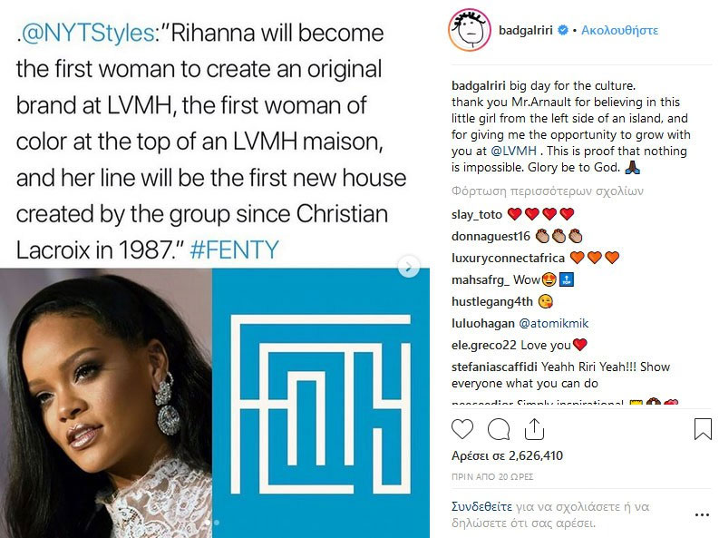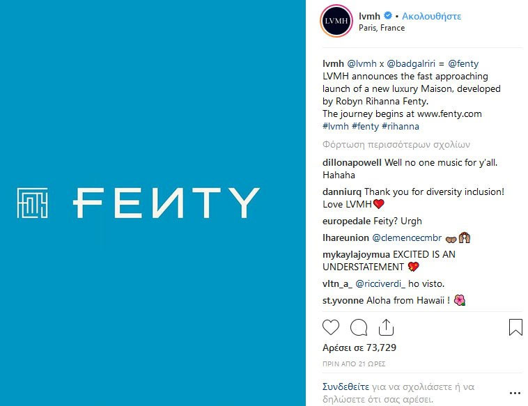 Μετά από μήνες έντονης φημολογίας, ο οίκος Moët Hennessy Louis Vuitton LVMH επιβεβαίωσε επισήμως την συνεργασία του με την Rihanna και τα πρώτα προϊόντα της νέας συλλογής, θα αποκαλυφθούν στις 22 Μαΐου.