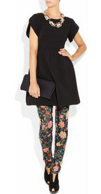 Εμπριμέ λέγκινκς στη μέση που συνδυάζονται με μαύρο μίνι φόρεμα και κατάμαυρα booties κοστίζουν 1,078 ευρώ.