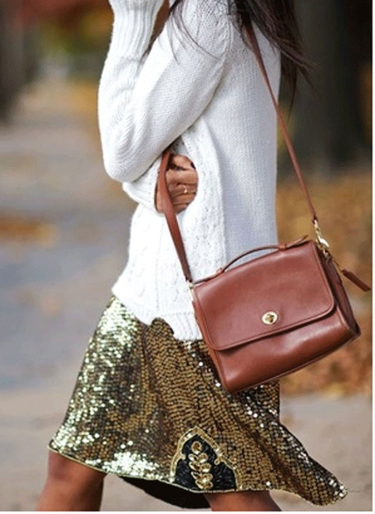 Επίσης, μπορούμε να πετύχουμε άψογο στιλ συνδυάζοντας μια απαστράπτουσα φούστα με ένα κλασικό μεσάτο σακάκι και ένα απλό t-shirt με στάμπα. Ακόμα και ένα απλό φούτερ ή ένα πλεκτό!
