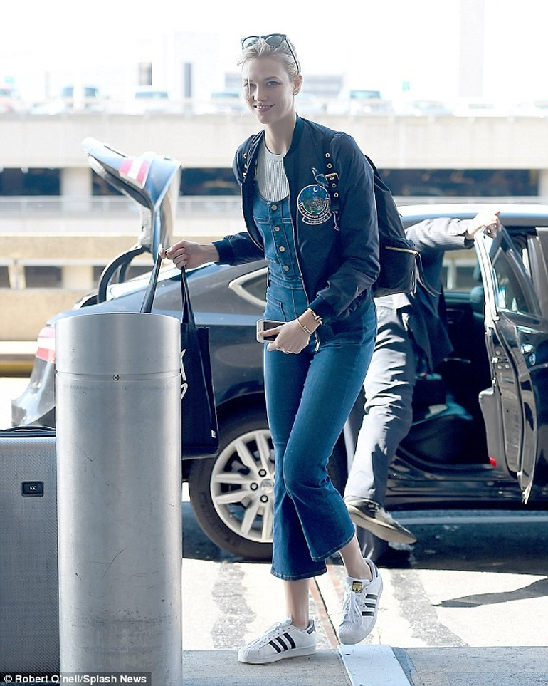 Φόρεσε μία ολόσωμη τζιν φόρμα από την εταιρεία Frame αξίας 312 δολαρίων, από μέσα ένα λευκό τοπ και royal blue bomber jacket που είναι η τελευταία λέξη της μόδας στα πανωφόρια. Το outfit ολοκλήρωσε με ένα ζευγάρι λευκά αθλητικά με μαύρες ρίγες και μαύρο backpack.