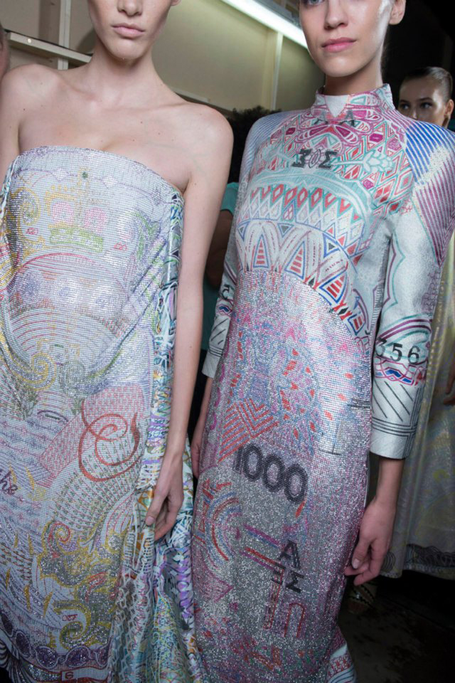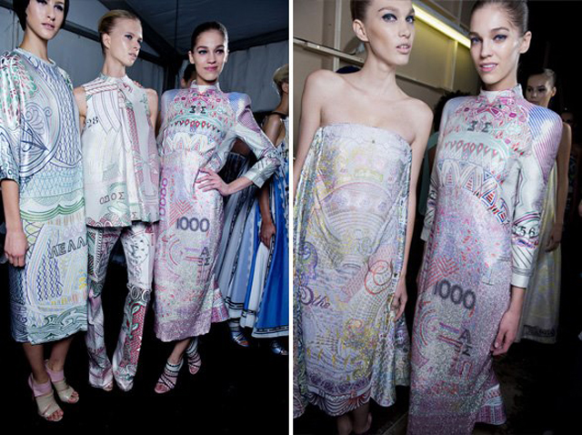 Αυτό που τράβηξε όμως τη προσοχή μας, είναι το γεγονός ότι η ταλαντούχα Ελληνίδα, χρησιμοποίησε τα πάλαι ποτέ χιλιάρικα, μάλλον, δεκαχίλιαρα για να είμαστε ακριβείς, πάνω στα φορέματα της! Όλοι γνωρίζουμε ότι πολύς λόγος έχει γίνει για την επιστροφή της δραχμής στη χώρα μας. Προφανώς η όλη συζήτηση, ενέπνευσε την σχεδιάστρια να συμπεριλάβει τη δραχμή στην συλλογή της. Σίγουρα θα σκέφτηκε, αφού πολλοί νοσταλγούν την επιστροφή της δραχμής, ας την φορέσουν!