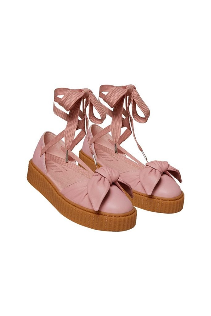 H Rihanna επιστρέφει με μια νέα κυκλοφορία από τη συλλογή της Fenty x Puma δημιουργώντας αυτά τα παπούτσια για το καλοκαίρι. Τα Sandals Creeper Bow Sandal είναι η καλοκαιρινή εκδοχή των αγαπημένων παπουτσιών των fans, των Creeper Sneakers, με την περίφημη σόλα του παπουτσιού και με κορδόνια που τυλίγονται γύρω από τους αστραγάλους. Διαθέτουν ένα κομψό, δερμάτινο φιόγκο στο πάνω μέρος – κάτι που είδαμε στη συλλογή Spring 17 sneakers με τα ανοιξιάτικα, πάνινα παπούτσια της Rihanna.