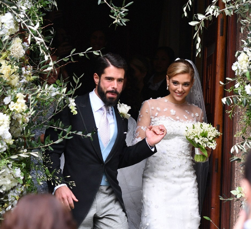 Όπως ήταν αναμενόμενο τα βλέμματα ήταν όλα στραμμένα στη νύφη που επέλεξε ένα ονειρικό νυφικό, μια δημιουργία haute couture του οίκου Valentino, κεντημένο στο χέρι, με μακρύ πέπλο και μοναδικό κόσμημα τα διαμαντένια σκουλαρίκια της.