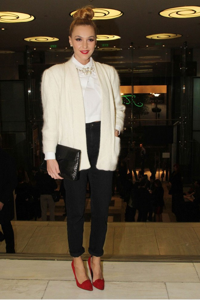 Συγκεκριμένα, φόρεσε λευκή μοχέρ ζακέτα πάνω από το μαύρο cigarette παντελόνι, τα οποία συνδύασε με λευκό πουκάμισο και statement κολιέ και μαύρο φάκελο.