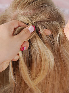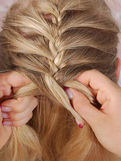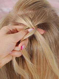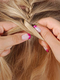 Τώρα παίρνετε εναλλάξ μια τούφα από δεξιά και μια από αριστερά, και τις πλέκετε μαζί με τα υπόλοιπα μαλλιά.