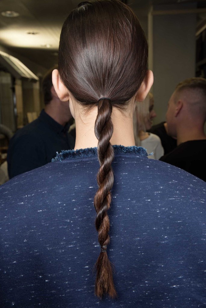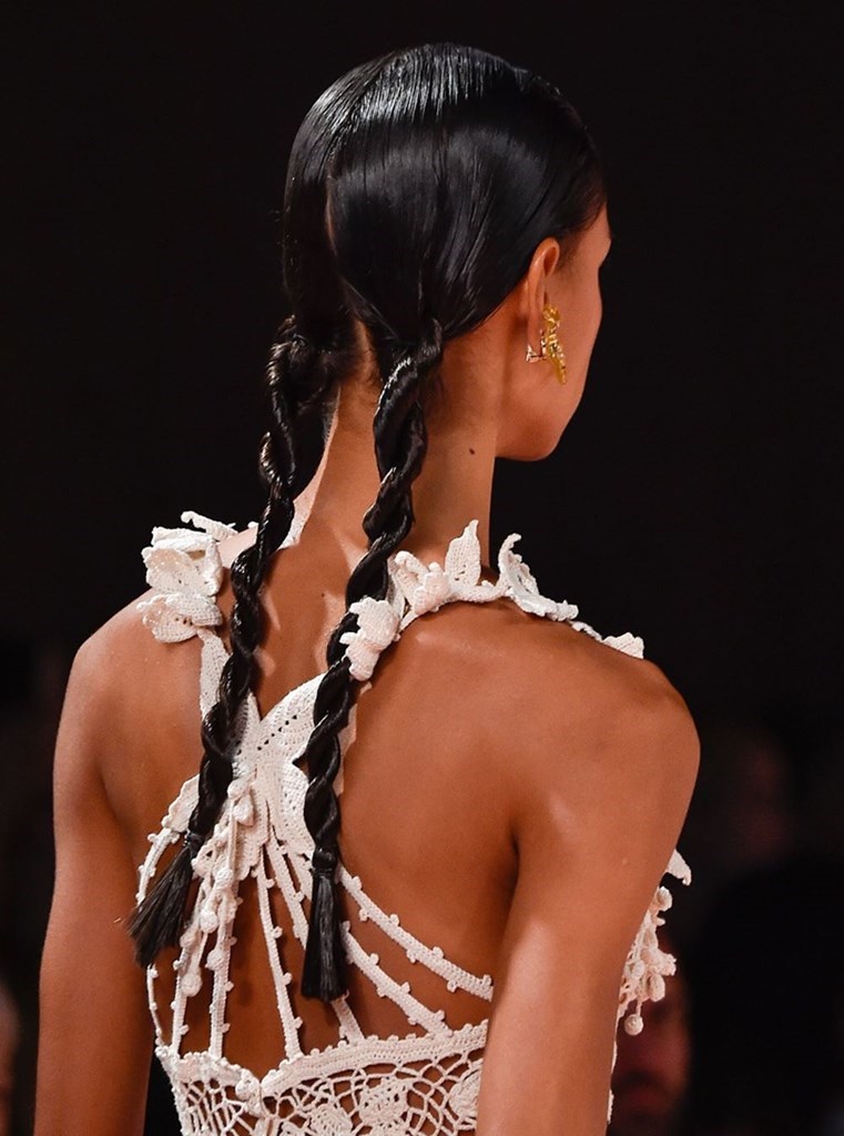Για να δημιουργήσετε το hair look που παρουσίασε το fashion brand Ulla Johnson στο ανοιξιάτικο show του, στερεώστε τα μαλλιά σε δύο χαμηλές αλογοουρές, χωρίστε τες στα δύο, στριφογυρίστε κάθε τούφα και στη συνέχεια στριφογυρίστε τες μαζί, στερεώνοντας την πλεξούδα στο τέλος με ένα hair band.