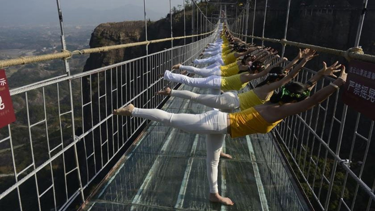 Μία ομάδα γυναικών στην Κίνα αποφάσισε να κάνει γιόγκα σε μια πραγματικά εντυπωσιακή γυάλινη γέφυρα, η οποία βρίσκεται στο εθνικό πάρκο της επαρχίας Χουάν.