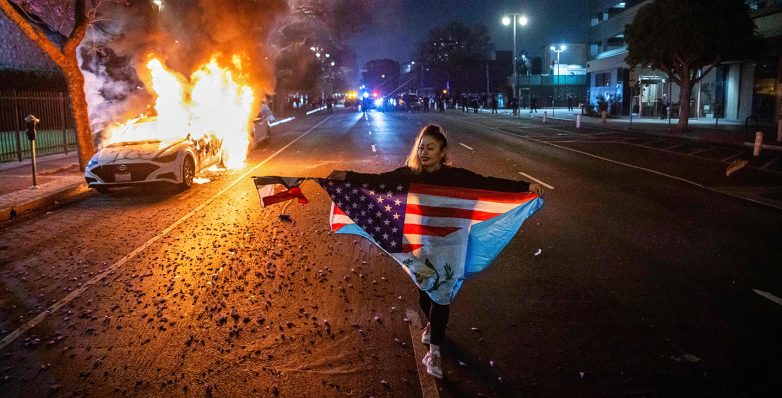 Μια κοπέλα περπατάει στους δρόμους του Λος Άντζελες, όπου αμάξια φλέγονται και διαδηλωτές συγκρούονται με τις Αρχές, κρατώντας διάφορες σημαίες, σε ένδειξη διαμαρτυρίας για τη μεταναστευτική πολιτική του Ντόναλντ Τραμπ… (Φωτογραφία: AP/Ethan Swope)