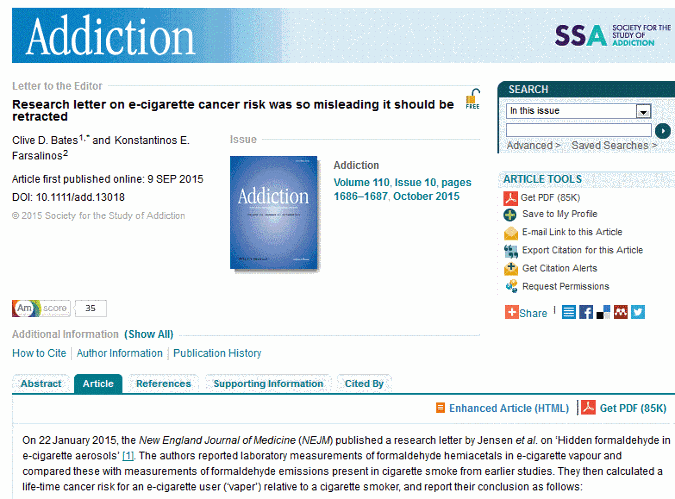 Ο Δρ. Κωνσταντίνος Φαρσαλινός με τον Δρ. CliveBates και με την υπογραφή 40 ακόμα επιστημόνων, δημοσίευσαν τον αντίλογο των παραπάνω πορισμάτων στο επιστημονικό περιοδικό «Addiction», μαζί με την πλήρη αιτιολόγηση των ισχυρισμών τους.