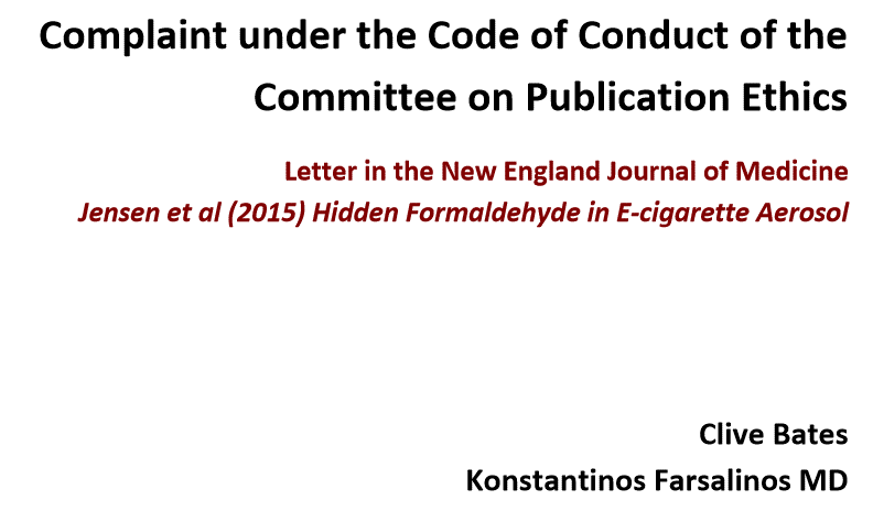 Καταρρίπτεται με τον πλέον επιστημονικά διαπιστωμένο τρόπο η έρευνα που είχε δημοσιευτεί στο «New England Journal of Medicine», σύμφωνα με την οποία τα ηλεκτρονικά τσιγάρα περιλαμβάνουν 10 έως 15 φορές υψηλότερα επίπεδα φορμαλδεΰδης σε σχέση με τα συμβατικά τσιγάρα.