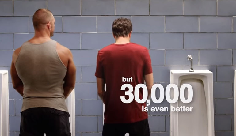 Επιστρατεύοντας το χιούμορ, η συγκεκριμένη διαφήμιση απεικονίζει δύο άντρες σε ουρητήριο και παραστατικά… αναδεικνύει ότι οι 30.000 συνδυασμοί γεύσεων που μπορούν να επιτευχθούν στα υγρά αναπλήρωσης του ηλεκτρονικού τσιγάρου είναι πολλοί και καλοί…
