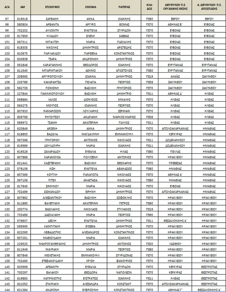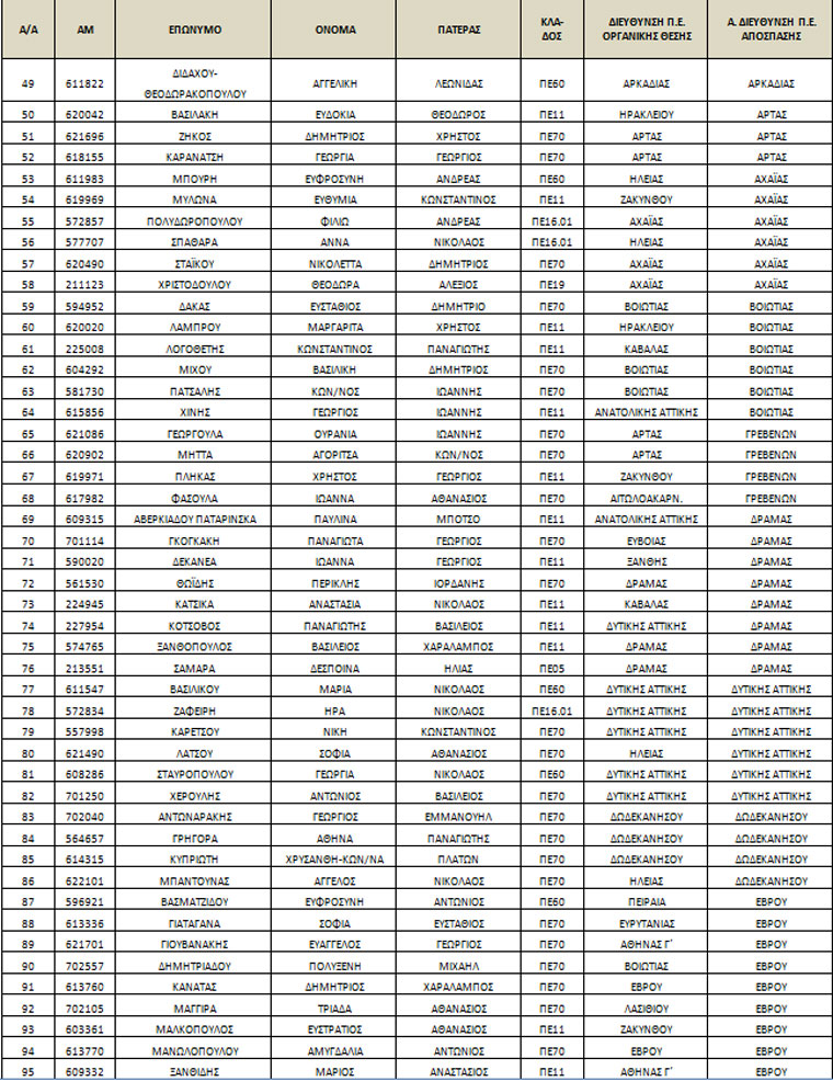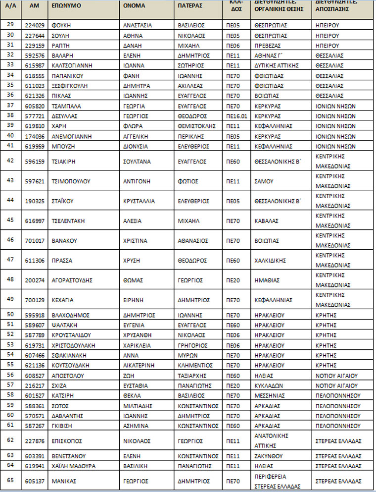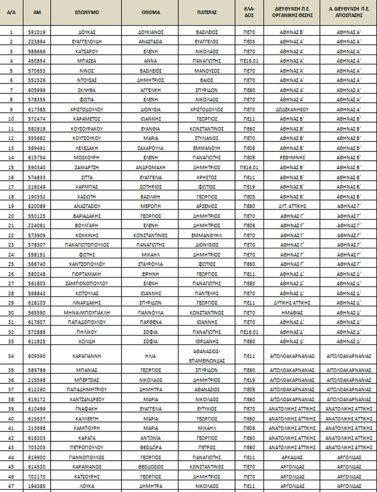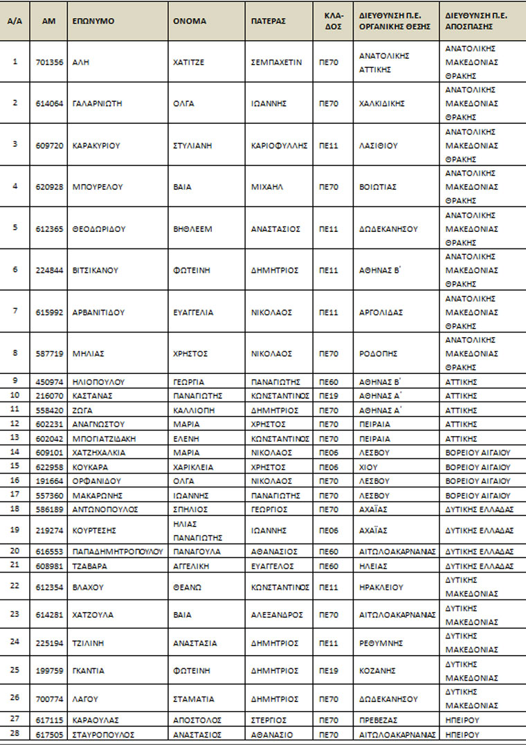 Eπίσης, όπως ανακοινώθηκε, οι παρακάτω εκπαιδευτικοί αποσπάστηκαν για το σχολικό έτος 2015-16 στις εξής Διευθύνσεις Πρωτοβάθμιας Εκπαίδευσης: