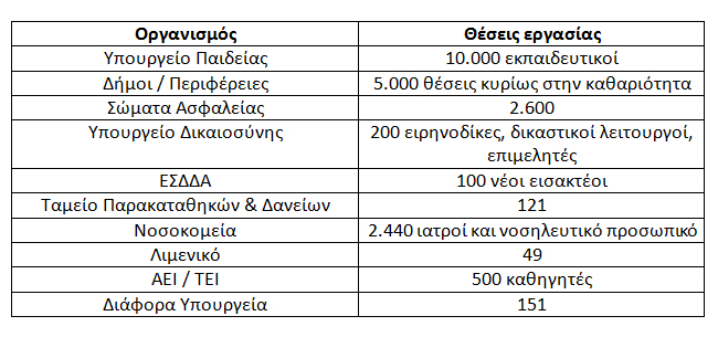Όσον αφορά στις μόνιμες προσλήψεις, ο σχεδιασμός για το 2016 προβλέπει την κάλυψη 21.161 θέσεων εργασίας σε Υπουργεία, Λιμενικό Σώμα, ΟΤΑ, Σχολεία, ΑΕΙ-ΤΕΙ. Από αυτές, οι 3.261 θα γίνουν μέσα στους πρώτες μήνες του νέου έτους.