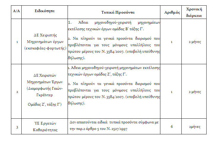 Η προκήρυξη αφορά στην πρόσληψη συνολικού αριθμού οκτώ ατόμων με σύμβαση εργασίας 2 μηνών, για τις εξής ειδικότητες, με τα αντίστοιχα ειδικά τυπικά προσόντα: