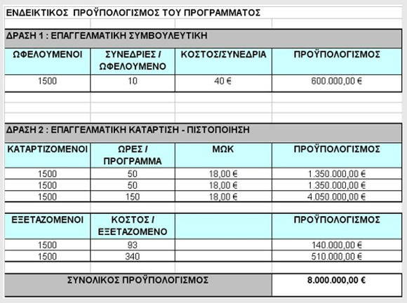 Το έργο απευθύνεται σε 1500 άτομα (ανέργους και απειλούμενους από ανεργία) και περιλαμβάνει: