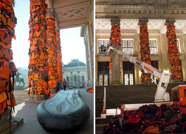 Σε μια διαφορετικού τύπου εικαστική παρέμβαση προχώρησε ο διάσημος Κινέζος καλλιτέχνης Ai Weiwei, υψώνοντας ένα ολόκληρο «βουνό» από σωσίβια προσφύγων έξω από μια αίθουσα συναυλιών στο Βερολίνο.