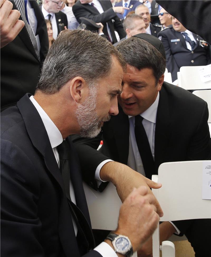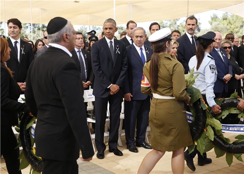 Για την κηδεία συγκεντρώθηκαν στην Ιερουσαλήμ 70 ξένοι ηγέτες, μεταξύ των οποίων ο πρόεδρος των ΗΠΑ Μπαράκ Ομπάμα (σ.σ.: ο οποίος ηγείται 30μελούς αντιπροσωπείας, ο πρώην Αμερικανός πρόεδρος Μπιλ Κλίντον, ο Φρανσουά Ολάντ της Γαλλίας, ο τέως πρόεδρος της Γαλλίας, Νικολά Σαρκοζί, ο Ντόναλντ Τουσκ της Ε.Ε., ο πρόεδρος της Ουκρανίας Πέτρο Ποροσένκο, ο Πρόεδρος της Δημοκρατίας Προκόπης Παυλόπουλος, ο πρόεδρος της Κυπριακής Δημοκρατίας, Νίκος Αναστασιάδης, ο πρωθυπουργός Ρέντσι της Ιταλίας, ο πρωθυπουργός του Καναδά Τζάστιν Τριντό, ο πρωθυπουργός του Βελγίου Σαρλ Μισέλ, ο βασιλιάς Φίλιππος ΣΤ΄της Ισπανίας , ο πρίγκιπας Κάρολος της Βρετανίας κ.α.