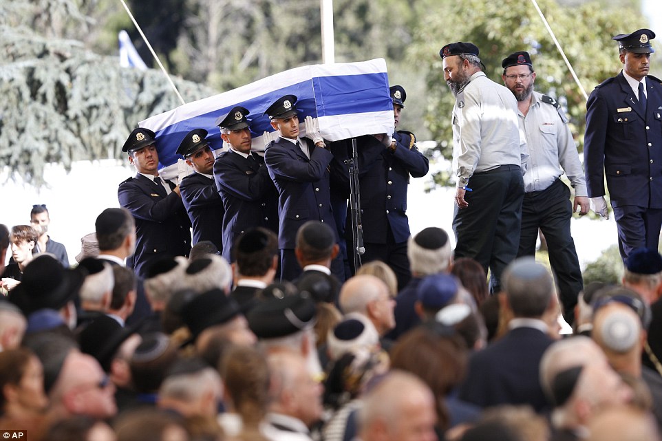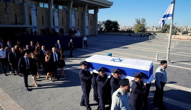 H κηδεία του άρχισε με τη μεταφορά του φέρετρου που είναι καλυμμένο με την ισραηλινή σημαία –υπό τον ήχο των εβραϊκών επικήδειων προσευχών– μέχρι το βήμα, όχι μακριά από τον τόπο όπου θα ταφεί ο Πέρες στο εθνικό κοιμητήριο στο όρος Χερτζλ.