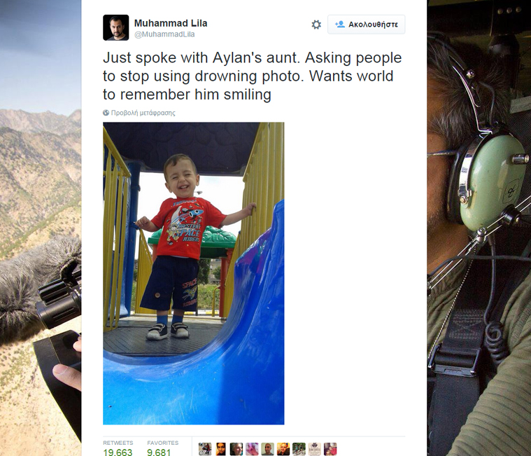 «Μόλις μίλησα με τη θεία του Αϊλάν. Ζητά ο κόσμος να σταματήσει να χρησιμοποιεί τη φωτογραφία του πνιγμού. Θέλει ο κόσμος να τον θυμάται να χαμογελά» αναφέρει στην ανάρτησή του ο δημοσιογράφος και την ολοκληρώνει με ένα χαρούμενο στιγμιότυπο από τη σύντομη ζωή του παιδιού.