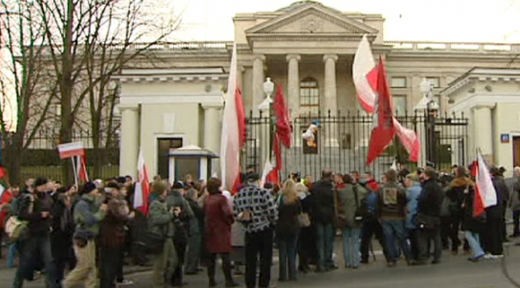 Την ίδια στιγμή εκατοντάδες υποστηρικτές του αντιπολιτευόμενου κόμματος, Νόμος και Δικαιοσύνη, συγκεντρώθηκαν έξω από το προεδρικό μέγαρο στη Βαρσοβία, προκειμένου να τιμήσουν τα θύματα του αεροπορικού δυστυχήματος.