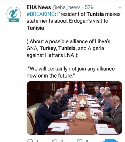 Την ίδια ώρα κατήγγειλε με σφοδρότητα τις δηλώσεις σχετικά με την ένταξη της Τυνησίας σε μια τουρκική συμμαχία.