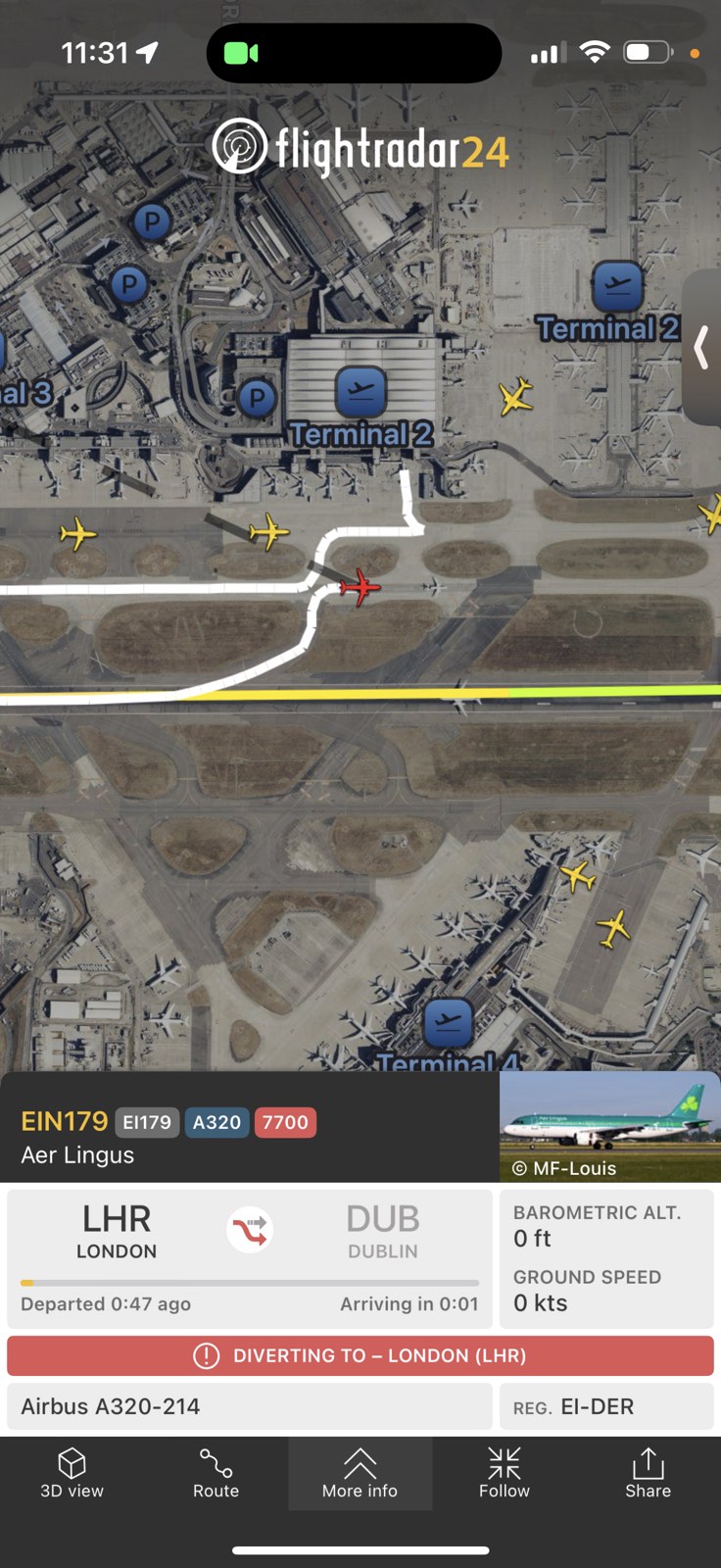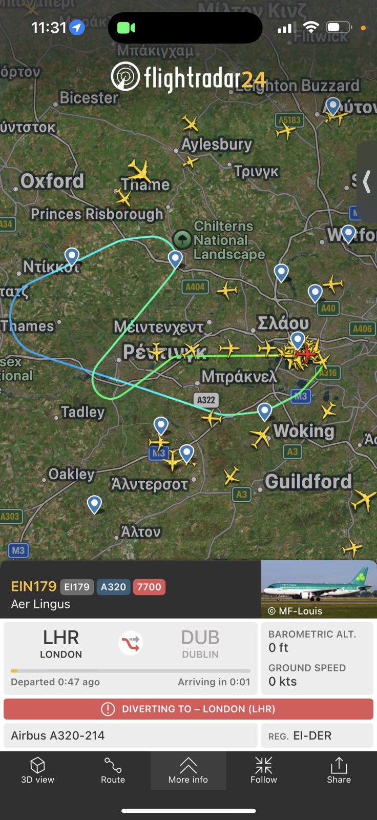 «Πριν από περίπου 20 λεπτά, η πτήση της Aer Lingus #EI179 / #EIN179 από το Χίθροου προς το Δουβλίνο επέστρεψε στο αεροδρόμιο του Χίθροου μετά το Squawking 7700, υποδεικνύοντας γενική κατάσταση έκτακτης ανάγκης. Σύμφωνα με έναν επιβάτη της πτήσης το αεροσκάφος υπέστη βλάβη στον αριστερό κινητήρα».