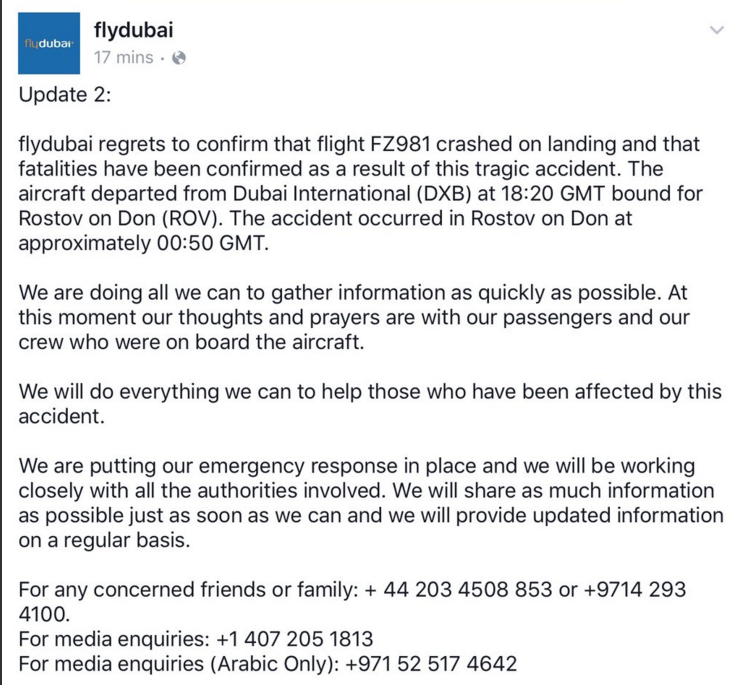 Aεροσκάφος Boeing 737 της αεροπορικής εταιρείας Flydubai του Ντουμπάι (Flydubai Flight 981), που πραγματοποιούσε την πτήση από το Ντουμπάι των Ηνωμένων Αραβικών Εμιράτων προς το Ροστόφ της Ρωσίας, συνετρίβη σήμερα το πρωί κατά την προσγείωσή του στο αεροδρόμιο Rostov-on-Don στο Ροστόφ στη νότια Ρωσία.