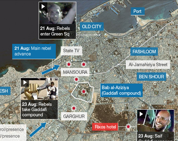Το μεγάλο ερώτημα αυτή τη στιγμή δεν είναι άλλο από το που βρίσκεται ο Καντάφι και οι γιοι του, ιδιαίτερα δε μετά το θρίλερ της νύχτας της Δευτέρας. Αμερικάνικες πληροφορίες τον τοποθετούν στην Αίγυπτο, είναι πιθανό όμως να έχει διαφύγει διαμέσου των υπόγειων στοών που βρίσκονται κάτω από την Τρίπολη.