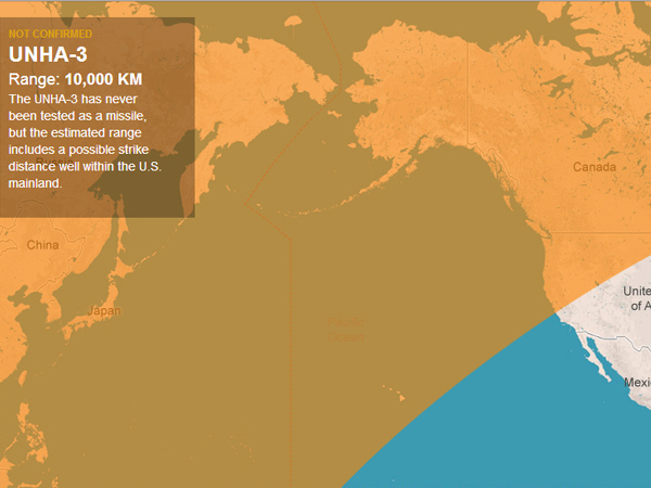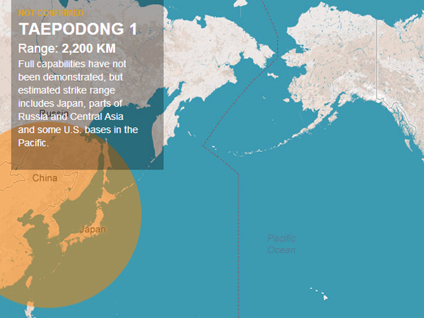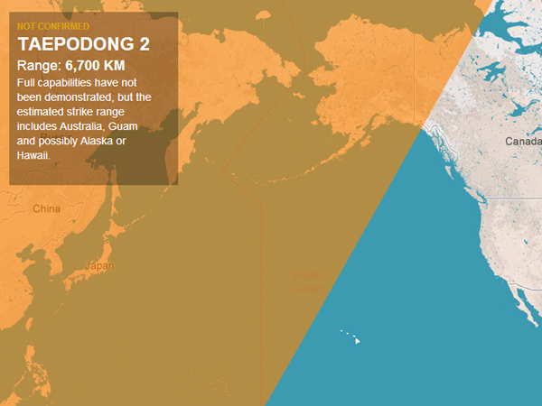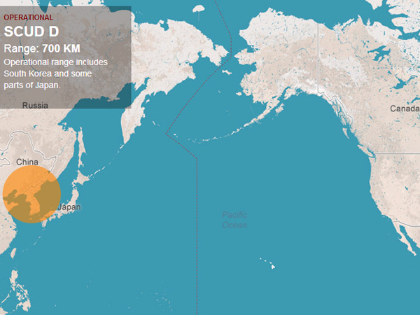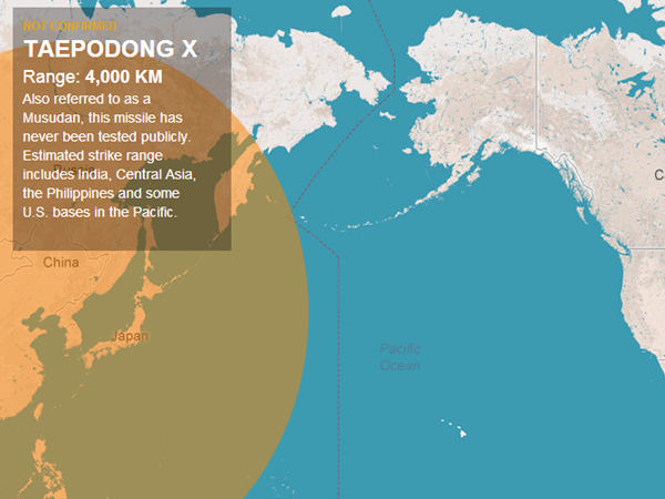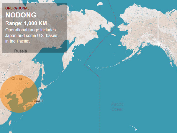 Ακολουθεί η εμβέλεια έξι καταγεγραμμένων πυραύλων που διαθέτει στο οπλοστάσιό της η Βόρειος Κορέα, όπως τους καταγράφει το CNN: