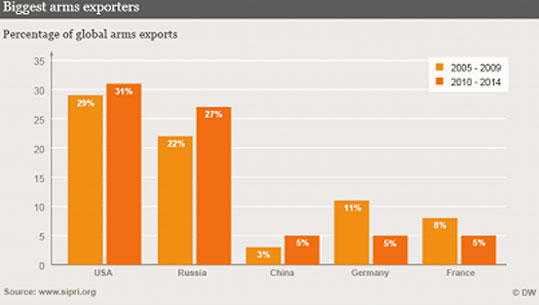 Μεγαλύτερος εξαγωγέας όπλων με μερίδιο αγοράς 31 % παραμένουν οι ΗΠΑ. Κατά το διάστημα 2010-2014 μάλιστα και σε σύγκριση με την προηγούμενη πενταετία, οι Αμερικανοί κατάφεραν να αυξήσουν τις εξαγωγές όπλων κατά 23 %.