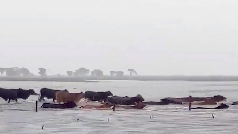Φωτογραφίες στα μέσα κοινωνικής δικτύωσης εικονίζουν πολυάριθμα βοοειδή παγιδευμένα σε κομμάτια γης που δεν έχουν πλημμυρίσει, αλλά περιβάλλονται από νερό, ή νεκρά και ετοιμοθάνατα μέσα στη λάσπη.