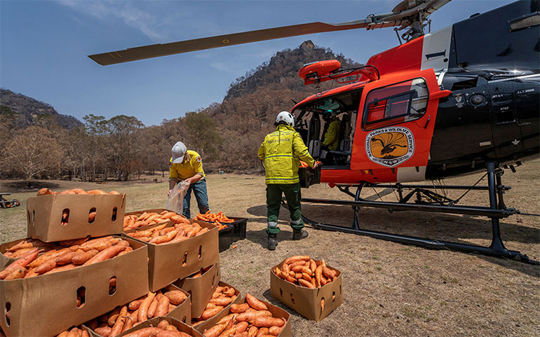 Ειδικότερα, οι Αρχές της νότιας Νέας Ουαλίας έχει επιστρατεύσει αεροπλάνα, τα οποία πετούν καρότα και γλυκοπατάτες σε περιοχές με πληθυσμούς καγκουρό γουάλαμπι, καθώς η φωτιά έχει αφανίσει τη βλάστηση γύρω από τον βραχώδη βιότοπό τους.