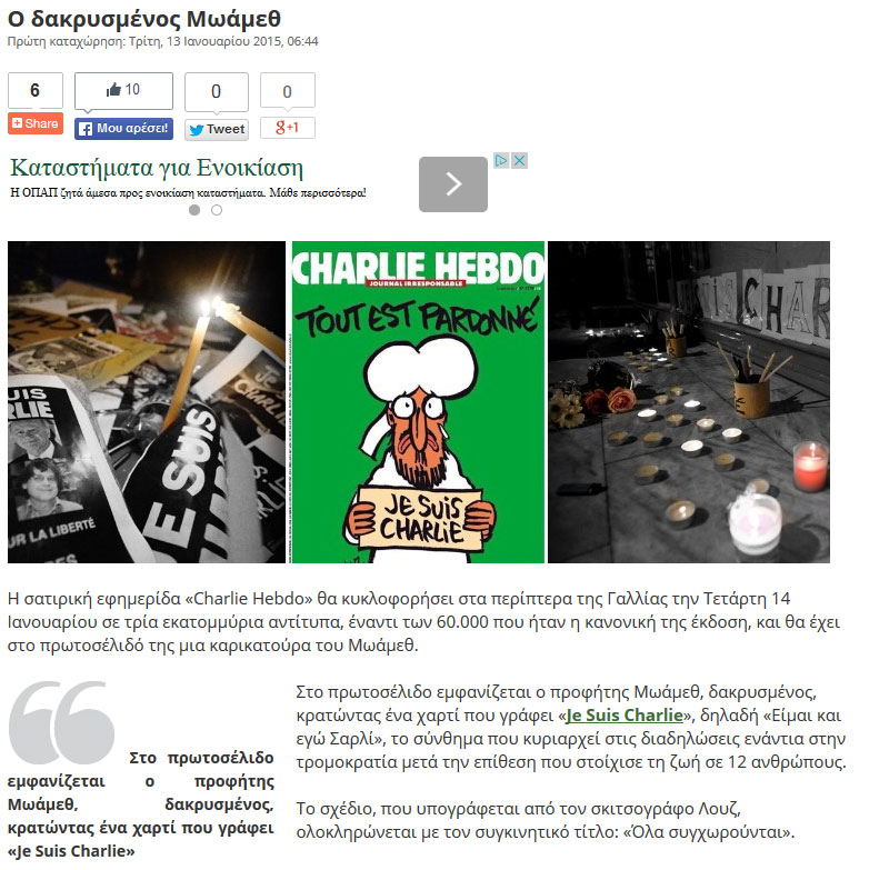 Το σατιρικό περιοδικό κυκλοφορεί σήμερα με πρωτοσέλιδο τον Προφήτη Μωάμεθ και τίτλο «Όλα συγχωρούνται». Εκτιμάται ότι έχουν τυπωθεί περισσότερα από 3.000.000 αντίτυπα, καθώς η ζήτηση αναμένεται τεράστια.