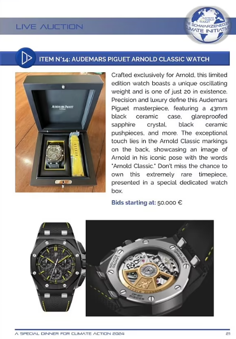 Το ακριβό ρολόι πρόκειται να κυκλοφορήσει απόψε στη δημοπρασία Schwarzenegger Climate Initiative στο Kitzbühel της Αυστρίας, με αρχική τιμή 50.000 ευρώ.