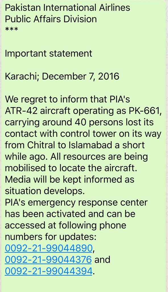Την είδηση για τη συντριβή επιβεβαίωσε η αεροπορική εταιρεία PIA με ανακοίνωση που εξέδωσε, στην οποία αναφέρει ότι ενεργοποίησε για το κοινό το κέντρο αντιμετώπισης καταστάσεων έκτακτης ανάγκης.