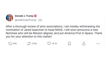 «Μετά από ενδελεχή ανασκόπηση προηγούμενων σχέσεων, αποσύρω την υποψηφιότητα του Τζάρεντ Άιζακμαν για την ηγεσία της NASA», δήλωσε ο Τραμπ σε ανάρτησή του. «Θα ανακοινώσω σύντομα νέο υποψήφιο, που θα είναι σύμφωνος με την αποστολή και θα θέσει την Αμερική, πρώτη στο Διάστημα».