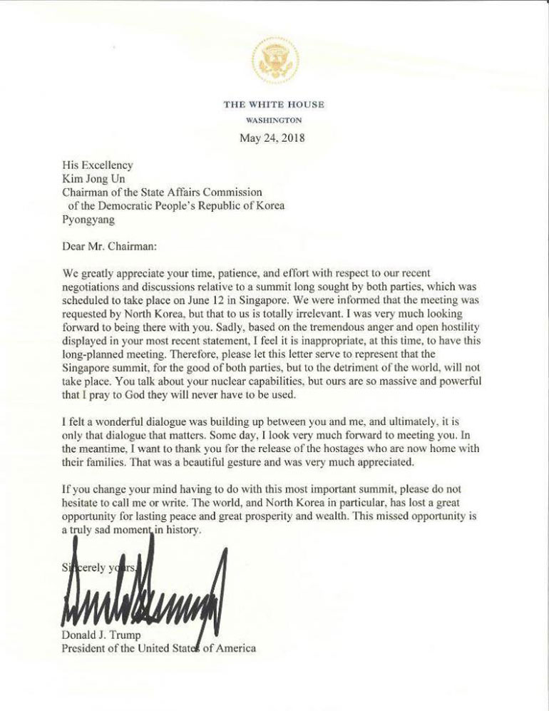 Ο πρόεδρος των ΗΠΑ υπογραμμίζει ότι «για το καλό των δύο πλευρών, όμως εις βάρος του υπόλοιπου κόσμου», η Σύνοδος της Σιγκαπούρης δεν θα διεξαχθεί, ενώ στην ίδια επιστολή τονίζεται η «ισχύς» του αμερικανικού πυρηνικού οπλοστασίου.