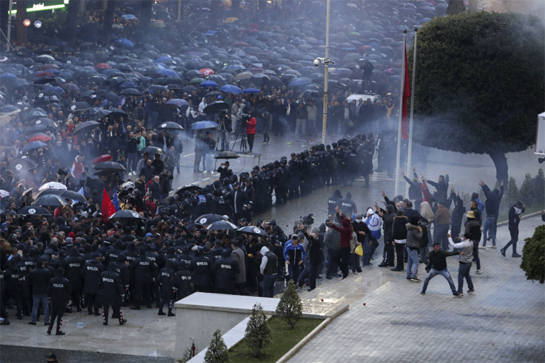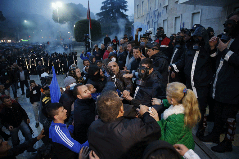 Σφοδρές συγκρούσεις ξέσπασαν το απόγευμα του Σαββάτου στα Τίρανα μεταξύ αστυνομικών και διαδηλωτών που φώναζαν συνθήματα κατά της κυβέρνησης του Έντι Ράμα ζητώντας τη διεξαγωγή κοινοβουλευτικών εκλογών.