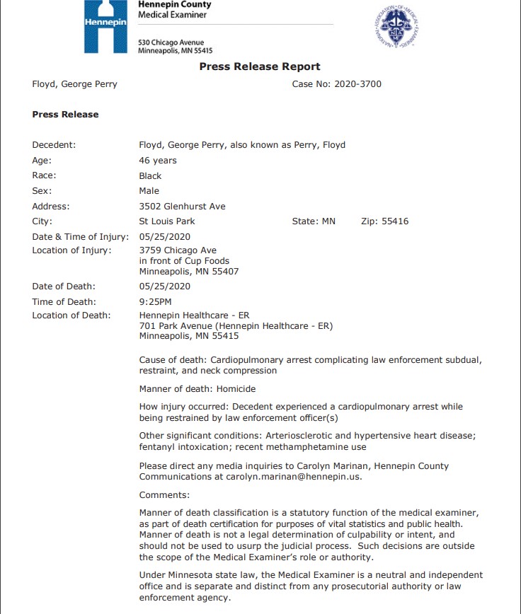 Η έκθεση κάνει ρητά λόγο για «ανθρωποκτονία» στο πεδίο «τρόπος θανάτου». Η δημοσιοποίησή της ακολούθησε την ανεξάρτητη νεκροψία-νεκροτομή που ζήτησε η οικογένεια του Φλόιντ, η οποία κατέληξε στο συμπέρασμα ότι ο θάνατός του οφειλόταν σε «ασφυξία».
