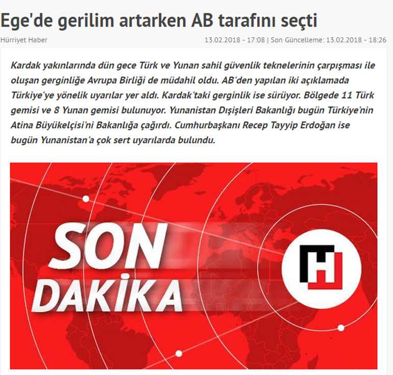 Η εφημερίδα Hurriyet αναφέρει χαρακτηριστικά ότι: «Ενώ κορυφώνεται η ένταση στο Αιγαίο, η Ευρωπαϊκή Ένωση επέλεξε να στηρίξει την ελληνική πλευρά».