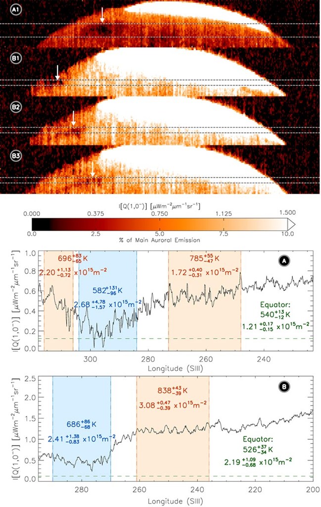 Όπως και στη Γη, η λάμψη του σέλαoς προέρχεται από ηλεκτρικά φορτισμένα σωματίδια που -καθοδηγούμενα από το μαγνητικό πεδίο- συγκρούονται με τη θερμόσφαιρα, το ανώτερο τμήμα της ατμόσφαιρας πάνω από τους δύο πόλους, παράγοντας έτσι το θεαματικό βόρειο και νότιο σέλας.