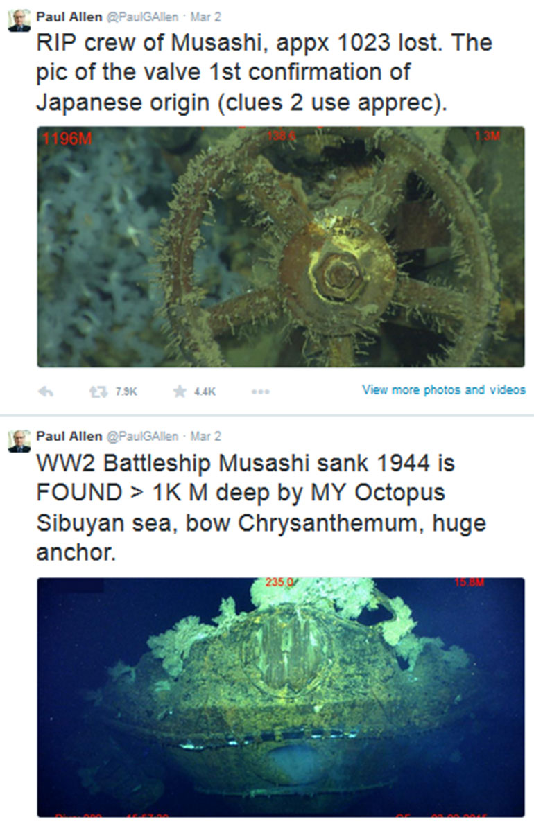 Ο Πολ Άλεν ανακοίνωσε την ανακάλυψη μέσω του λογαριασμού του στο Twitter, ανεβάζοντας φωτογραφίες από το ναυάγιο.